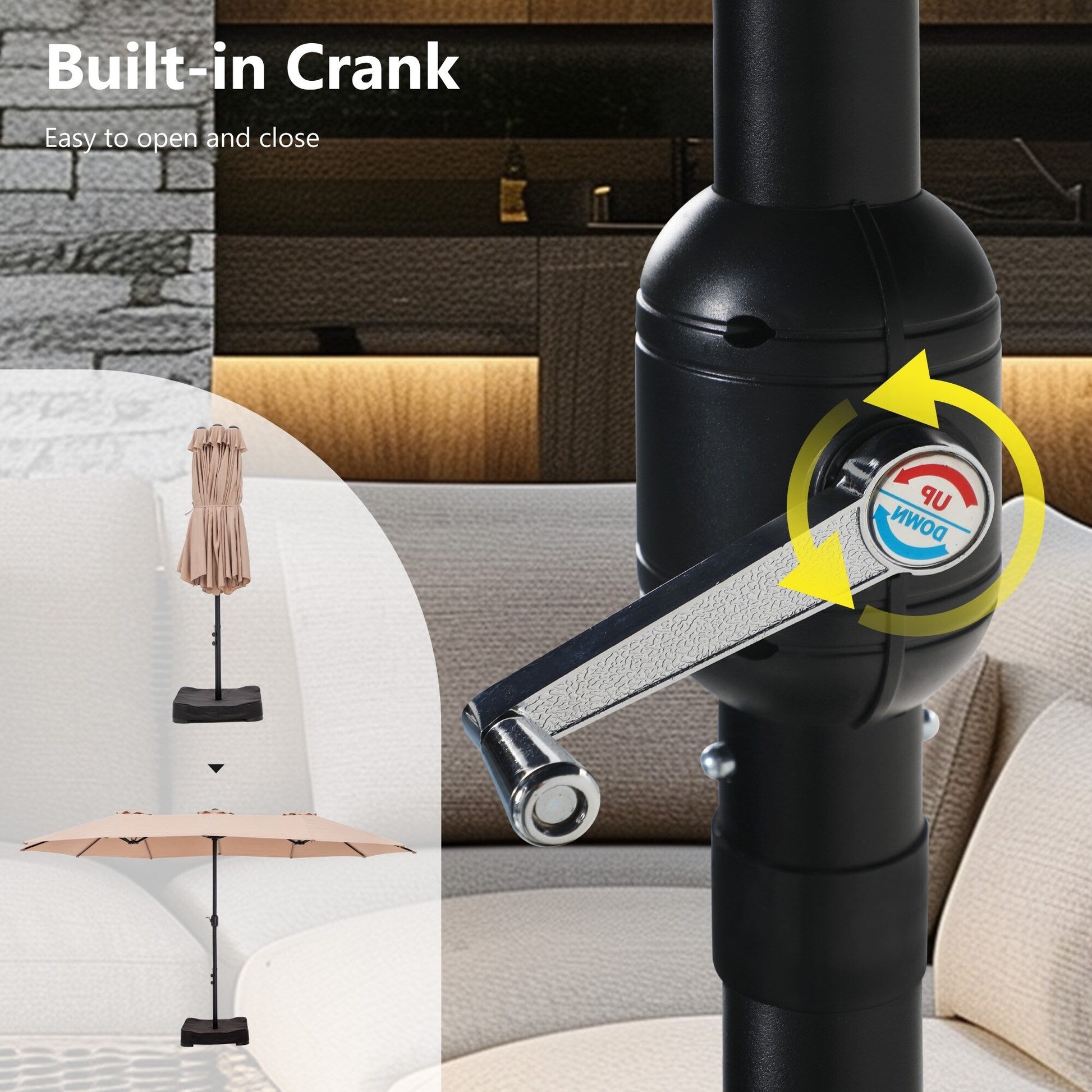 Parasol de marché extérieur rectangulaire à manivelle double face de 15 pieds, parasol de patio éclairé par LED solaire avec base incluse