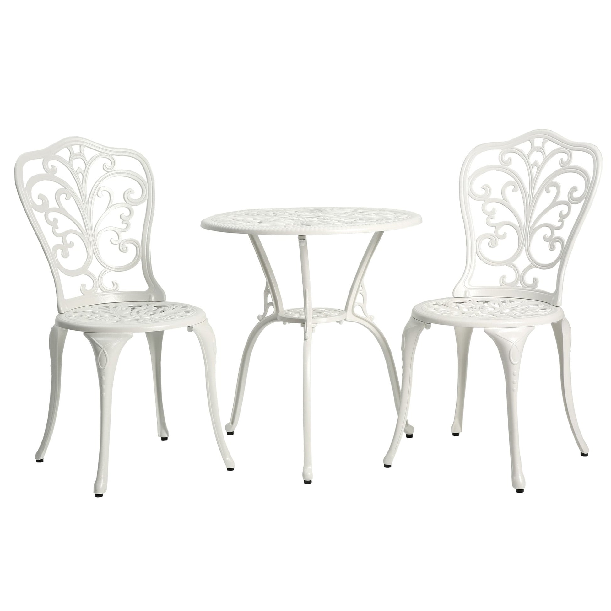 Profitez de votre espace extérieur avec cet ensemble de table bistrot 3 pièces en aluminium, orné de magnifiques sculptures de papillons et de finitions en cuivre antique. Fabriqué en fonte d'aluminium robuste avec traitement antirouille et résistant aux intempéries, cet ensemble est adapté à une utilisation par tous les temps et résiste à l'oxydation. Grâce à son trou pour parasol intégré de 4,4 cm, vous pouvez y ajouter un parasol de 2,3 m (non inclus) pour vous protéger du soleil et de la pluie. Facile à nettoyer et à assembler, cet ensemble est parfait pour décorer votre cour, votre bord de piscine, votre terrasse, votre jardin ou votre véranda.