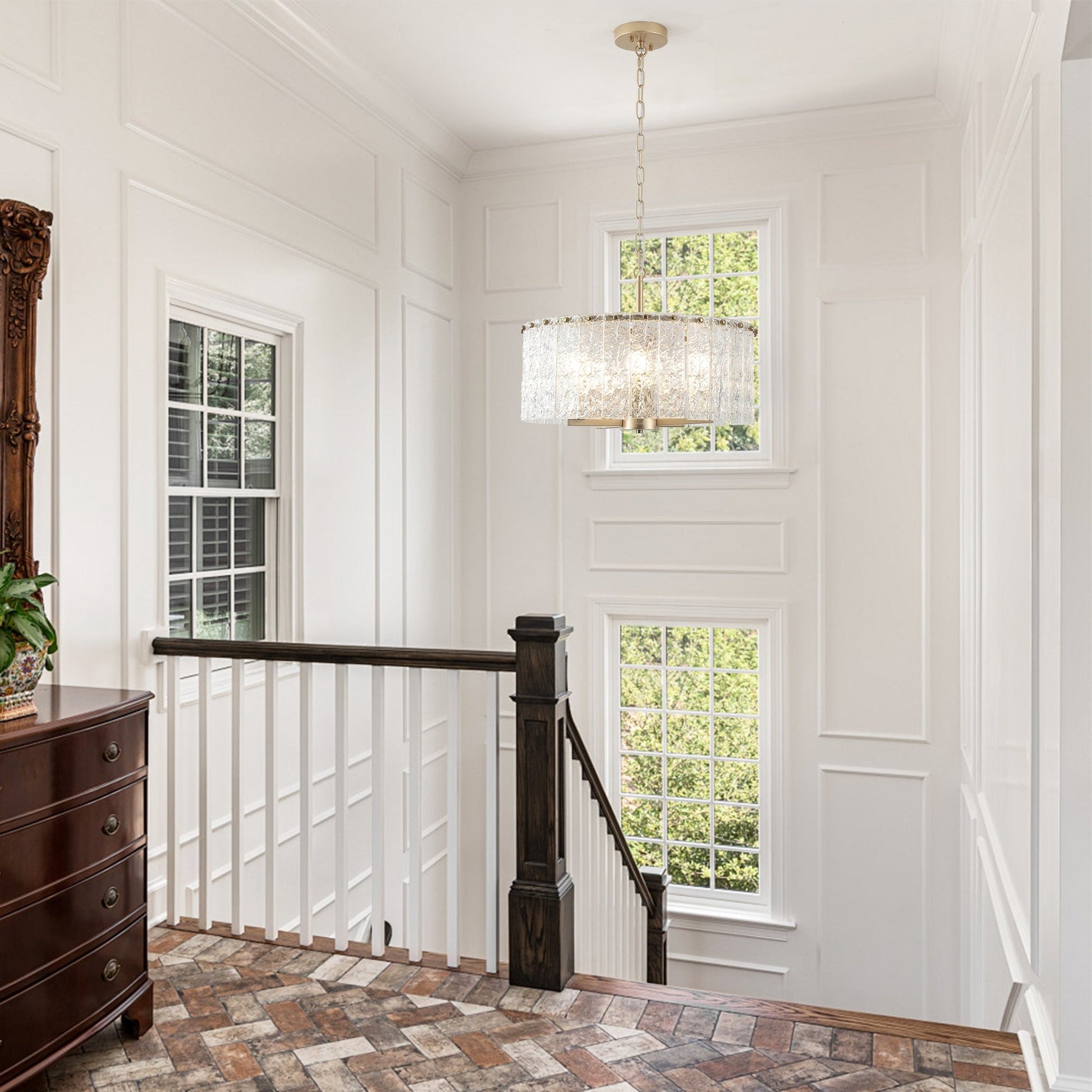 Illuminez votre îlot de cuisine avec élégance grâce à notre suspension tambour. Dotée d'un design époustouflant rehaussé de cristaux, cette suspension respire la sophistication et le luxe. Avec ses cinq lumières orientées vers le haut, elle offre un éclairage généreux tout en ajoutant une touche de glamour à votre espace. Fabriquée en métal, verre et véritable cristal chinois K9 de haute qualité, elle garantit durabilité et esthétique luxueuse. Sa longueur réglable permet un positionnement flexible, tandis que sa compatibilité avec les plafonds inclinés offre de nombreuses possibilités d'installation. Idéale pour les endroits secs, cette suspension allie style et fonctionnalité pour sublimer l'ambiance de votre cuisine. Attention : ampoules non incluses.