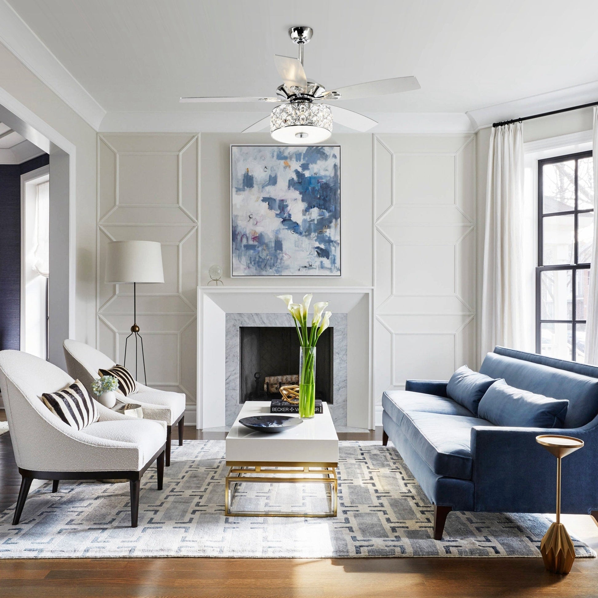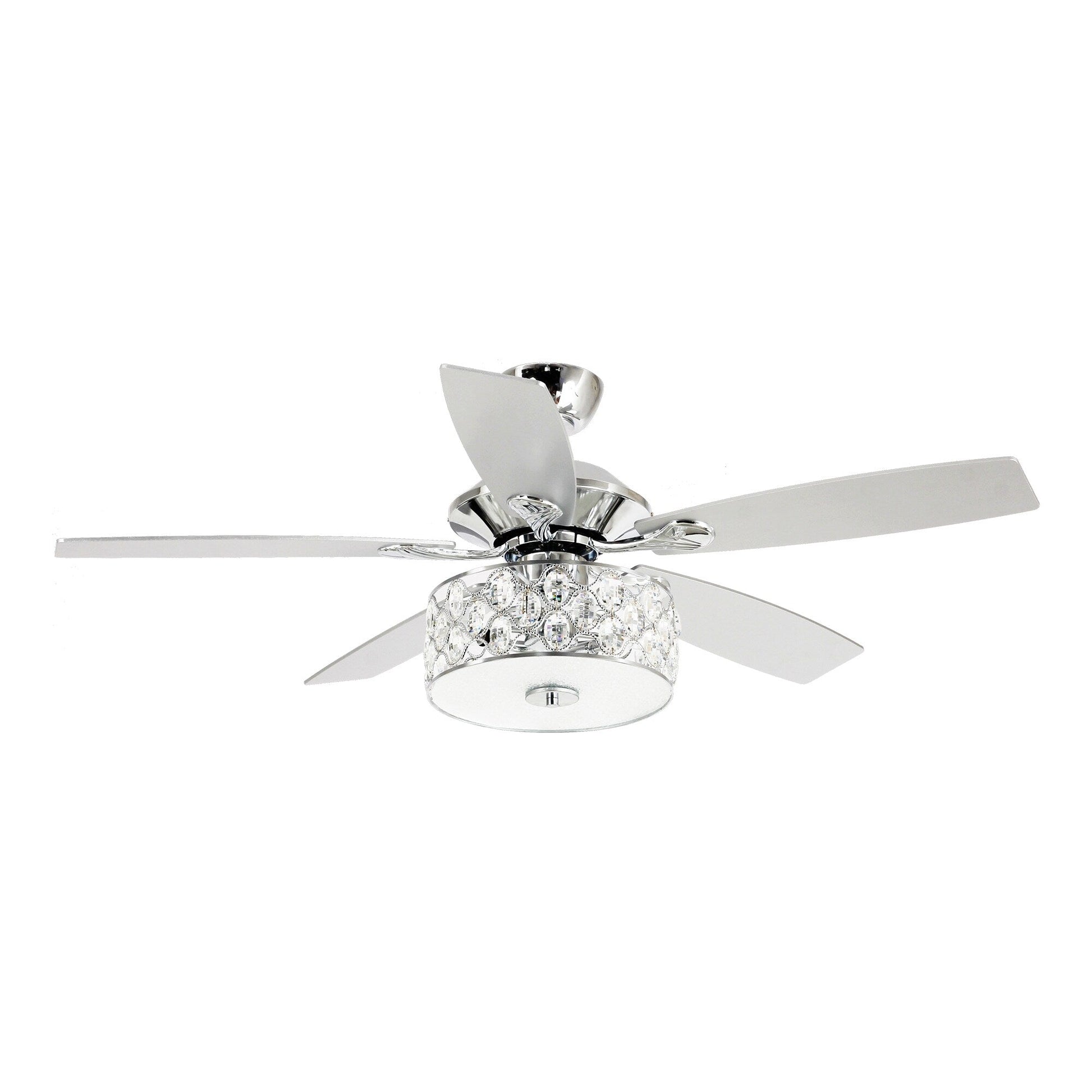 Apportez une touche de sophistication moderne à votre espace de vie avec ce ventilateur de plafond moderne de 13,7 m (52 pi) à 4 lumières en cristal avec télécommande. Son cadre en métal chromé et ses pales en bois teinté argent lui confèrent un style élégant et moderne, idéal pour toutes les pièces de votre maison. Profitez des avantages d'un moteur réversible à trois vitesses, utilisable en hiver pour économiser de l'énergie. Une télécommande permet d'allumer et d'éteindre facilement la lumière et de régler la vitesse du ventilateur à votre convenance.