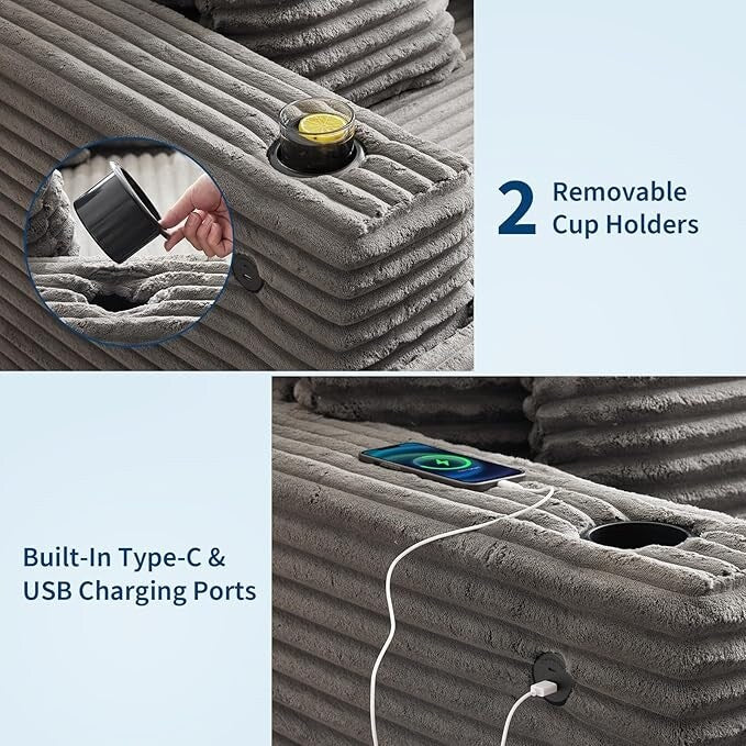 [Confort et espace détente] Profitez d'une détente exceptionnelle avec cette chaise longue surdimensionnée, dotée d'une largeur généreuse de 137 cm et d'une profondeur d'assise de 119 cm. Idéale pour la lecture, la sieste ou les soirées cinéma, elle offre un espace généreux pour vous et vos proches afin de vous détendre confortablement. Son design spacieux garantit une assise haut de gamme, ce qui en fait un ajout idéal aux salons, chambres et espaces de divertissement. [Revêtement en velours côtelé durable et de qualité supérieure] Fabriqué en velours côtelé respirant de haute qualité, ce canapé-lit allie luxe et durabilité. Sa texture douce procure une sensation de confort, tandis que la mousse haute densité et les ressorts ensachés à l'intérieur maintiennent la forme du fauteuil et offrent un soutien moelleux. Que vous jouiez, vous détendiez ou vous reposiez, le revêtement haut de gamme offre un confort et un style durables. [Soutien ergonomique complet] Conçue pour votre confort, cette chaise longue surdimensionnée est dotée d'une assise profonde et ergonomique qui soutient tout votre corps. Ce fauteuil favorise la détente pour lire, méditer ou se détendre après une journée bien remplie. Sa structure favorise une posture saine et réduit la fatigue, vous procurant une sensation de fraîcheur et de confort même en utilisation prolongée. [Pratique et pratique] Restez connecté sans effort grâce aux ports de charge intégrés au fauteuil convertible, qui vous permettent de recharger vos appareils tout en restant allongé. Les porte-gobelets amovibles sont pratiques et vous permettent de savourer vos boissons préférées sans avoir besoin de meubles supplémentaires. Ces fonctionnalités bien pensées optimisent votre détente, idéales pour lire ou regarder la télévision. [Assemblage simple et design moderne et élégant] Cette chaise longue moderne est facile à installer et à assembler, vous permettant de vous détendre rapidement. Son design élégant et contemporain s'intègre à une variété de styles d'intérieur, apportant sophistication et confort à tout espace. Que ce soit dans un salon, un bureau ou une chambre, c'est une solution d'assise élégante et pratique.