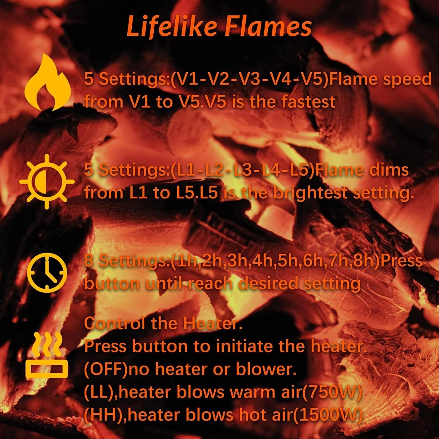 - Effet de flamme réaliste : cette cheminée peut être utilisée avec ou sans chaleur et offre des effets de flamme 3D réalistes, parfaits pour votre salon ou salle à manger. 12 couleurs de flammes, dont 3 couleurs classiques améliorées (rouge, orange et bleu), 5 vitesses de flamme, 5 niveaux de luminosité et 4 options de couleurs de feu carbone. Ce magnifique effet peut être utilisé avec ou sans chaleur, créant une ambiance onirique dans votre pièce.