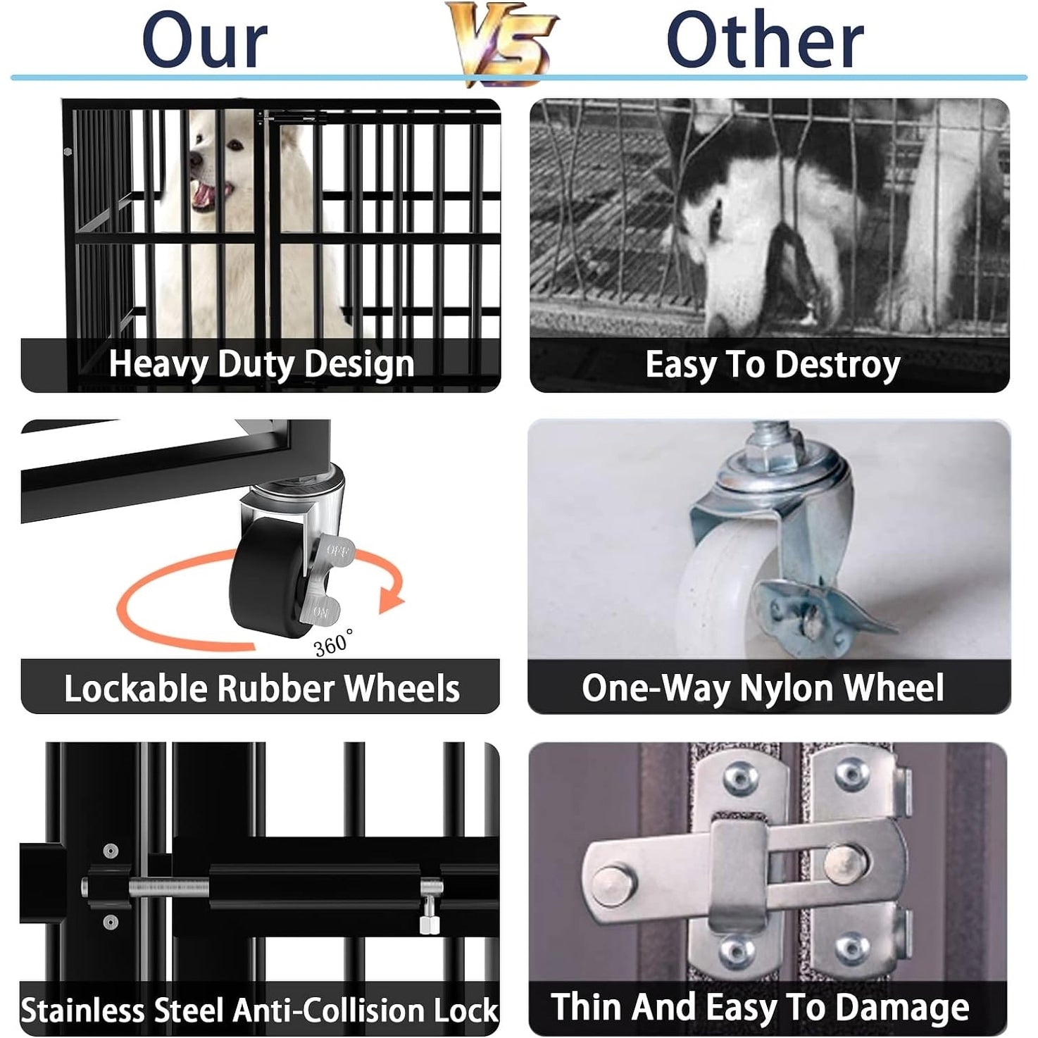 - 🐶【Facile à assembler et à déplacer】Les quatre roulettes pivotantes situées en bas sont verrouillables, et nous aimons le fait que la conception rend difficile pour les chiens très anxieux de s'échapper ou de se blesser ou d'endommager la cage. La plupart des pièces ont été pré-assemblées, équipées de quatre roues et de dix boulons à vis, cela ne prend que 10 minutes à terminer.