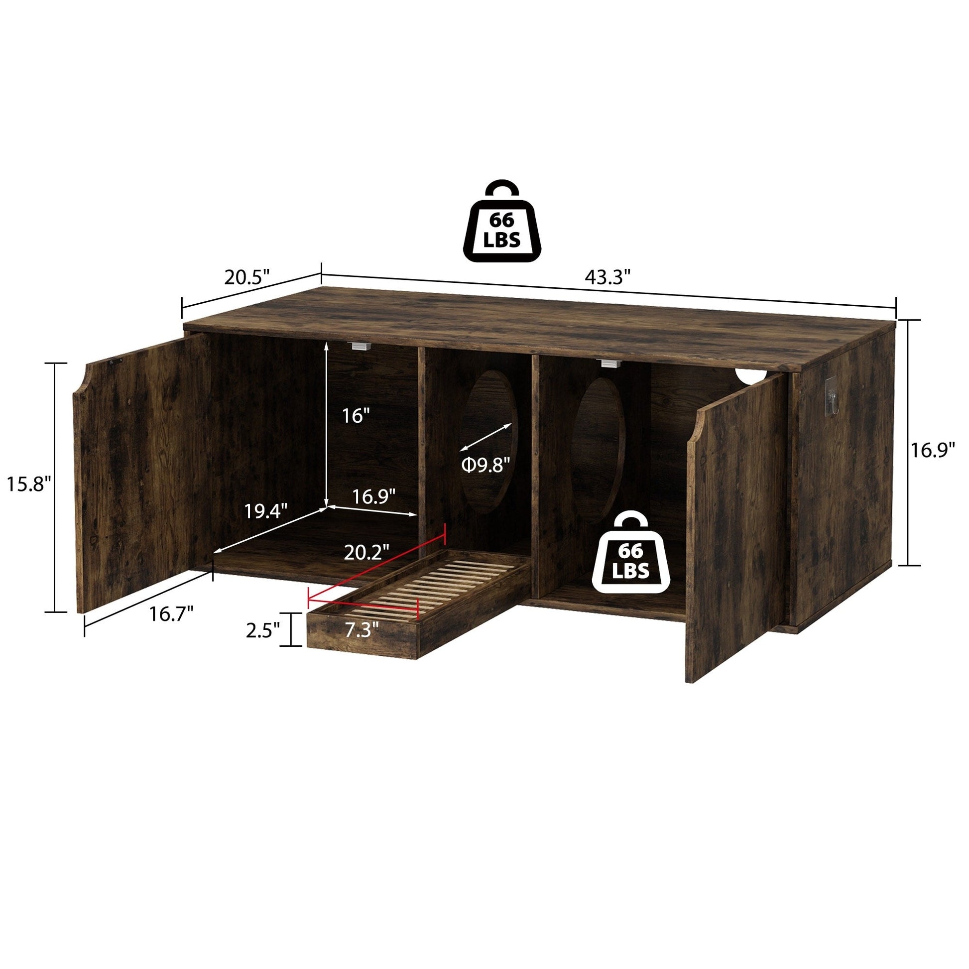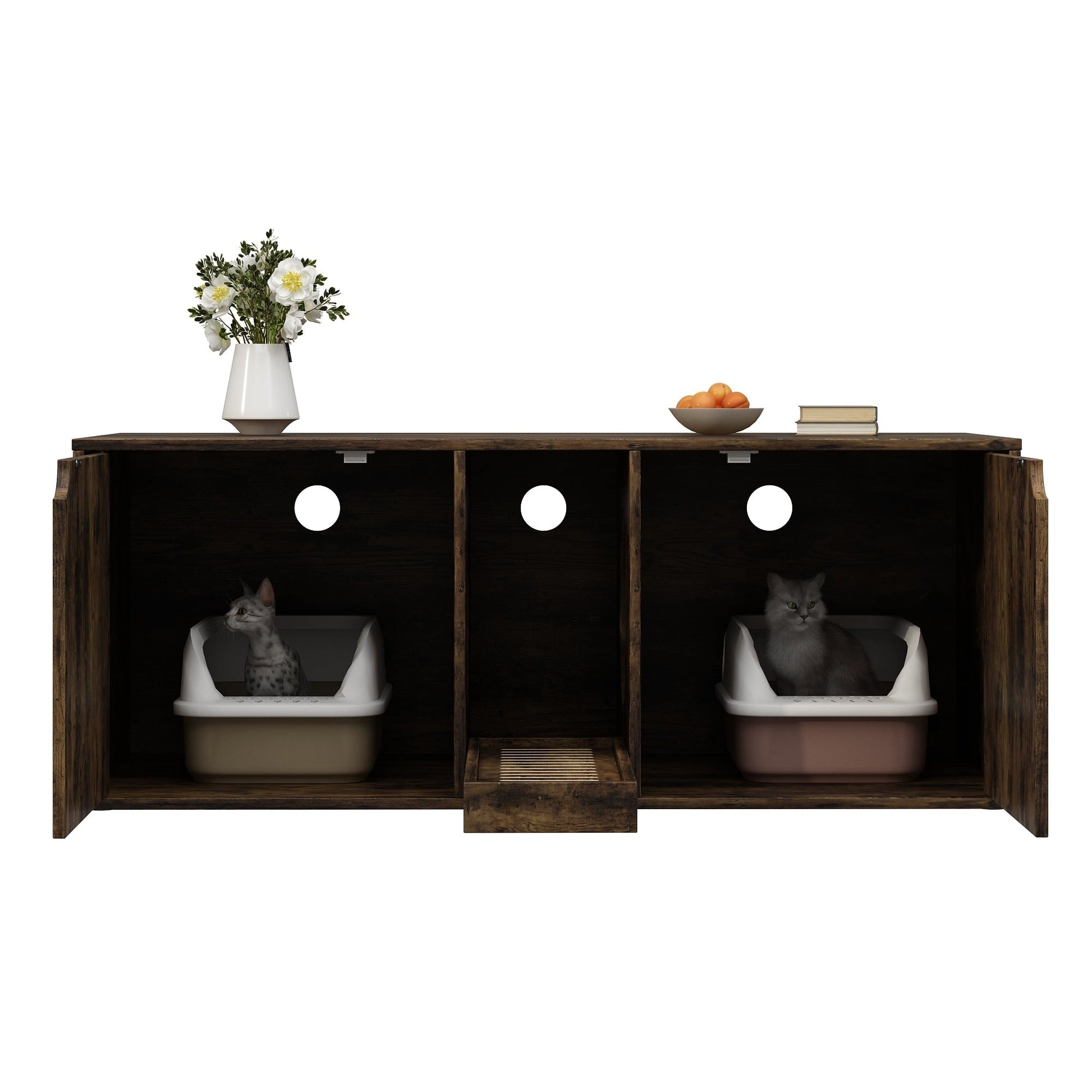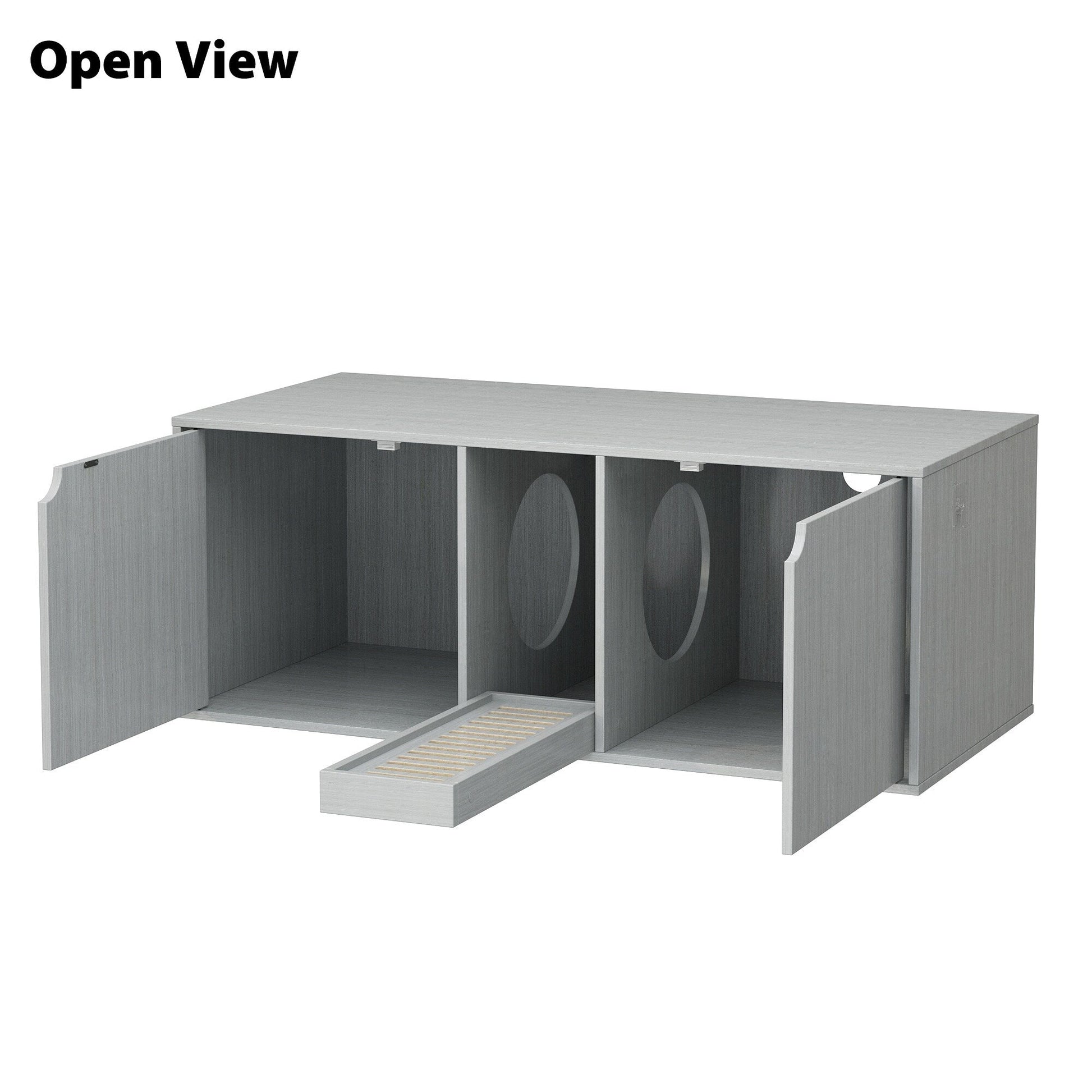●Our cat cabinet is vary spacious and is made to accommodate 2 litter pans, has double door opening, each cat has its own toilet and privacy. And a cat litter catch hallway in the middle where the catch is placed for the kitties to wipe their feet on when they leave.