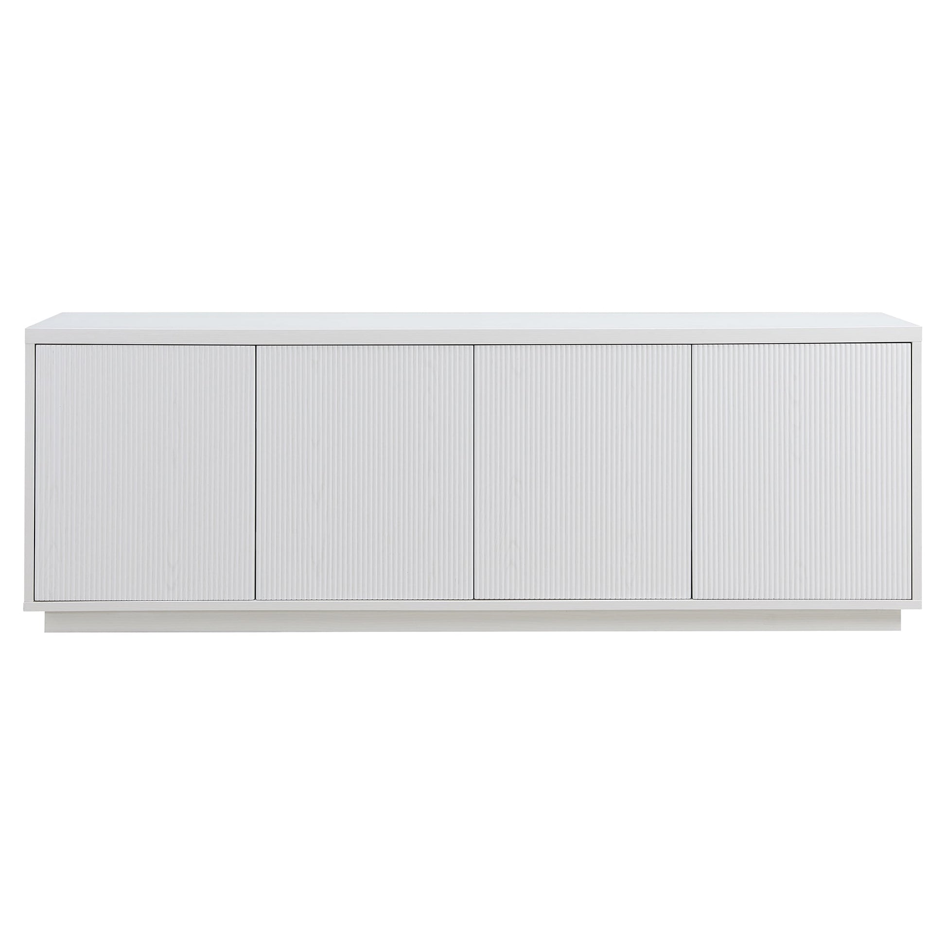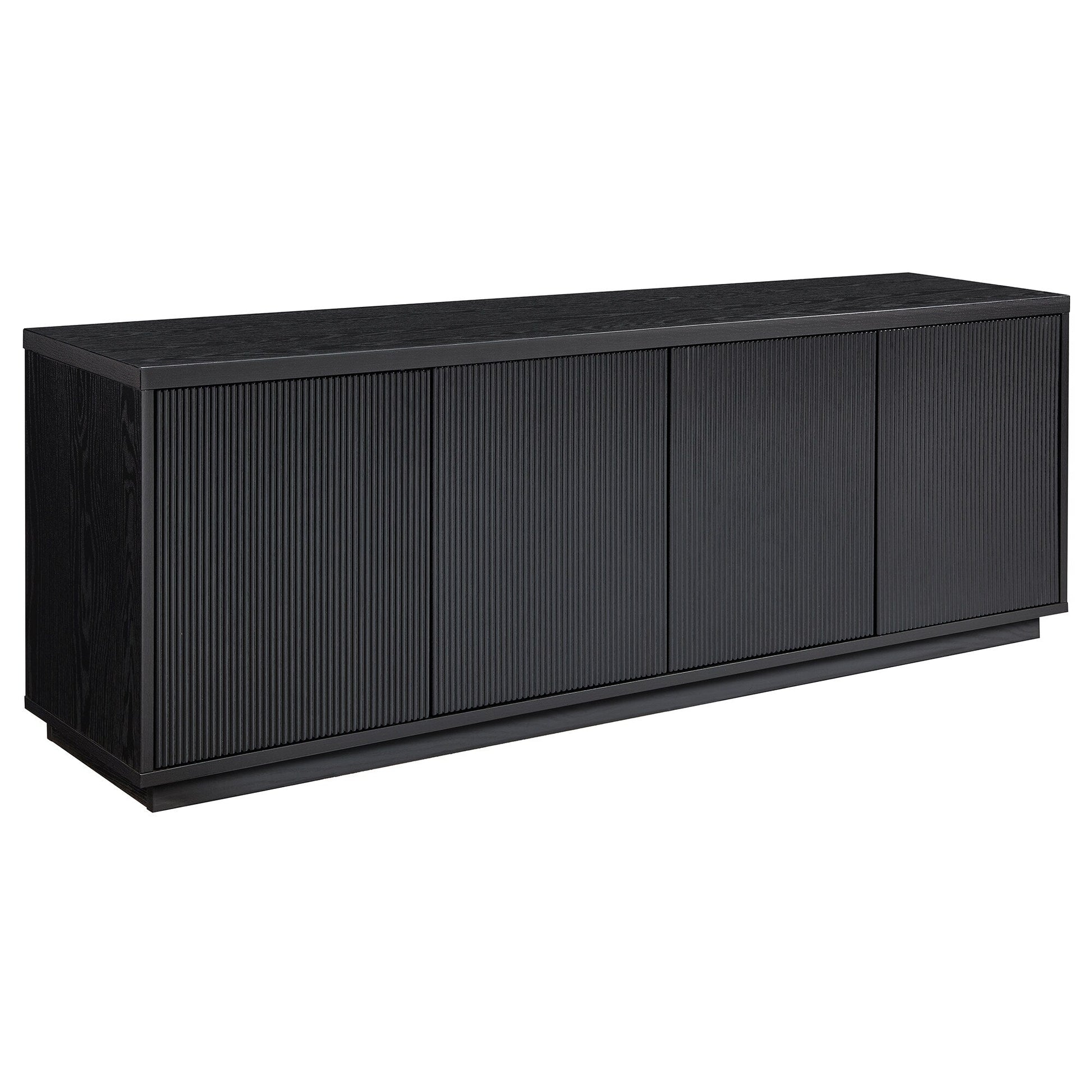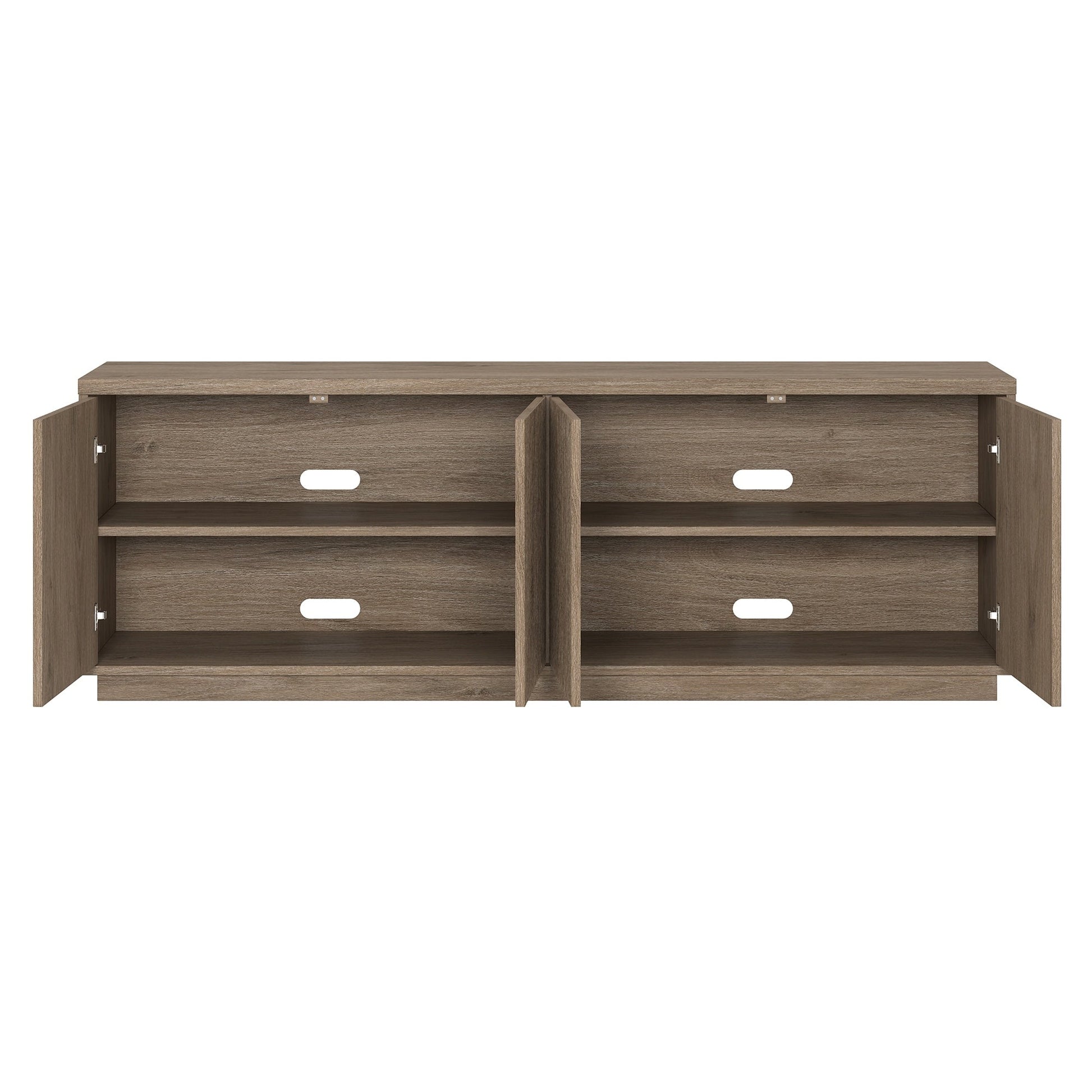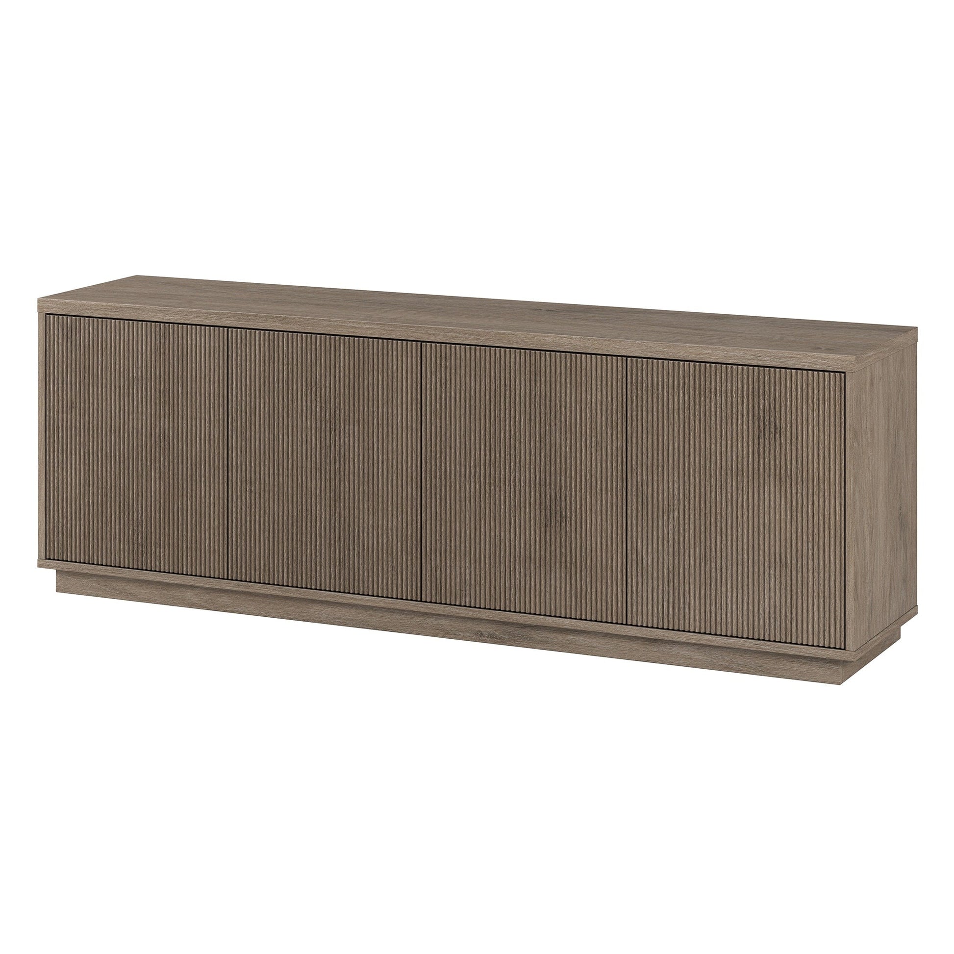 Texture et design tendance se marient dans ce meuble TV transitionnel. Avec sa finition imitation bois et ses portes texturées, ce meuble fera sensation dans votre salon, bureau ou salle de jeux. Son socle crée une illusion de transition harmonieuse avec le sol, comme s'il avait toujours été là. Son design moderne et contemporain comprend quatre portes entièrement fermées et quatre étagères intérieures, offrant un vaste espace de rangement pour vos appareils électroniques, jeux, livres et bien plus encore.