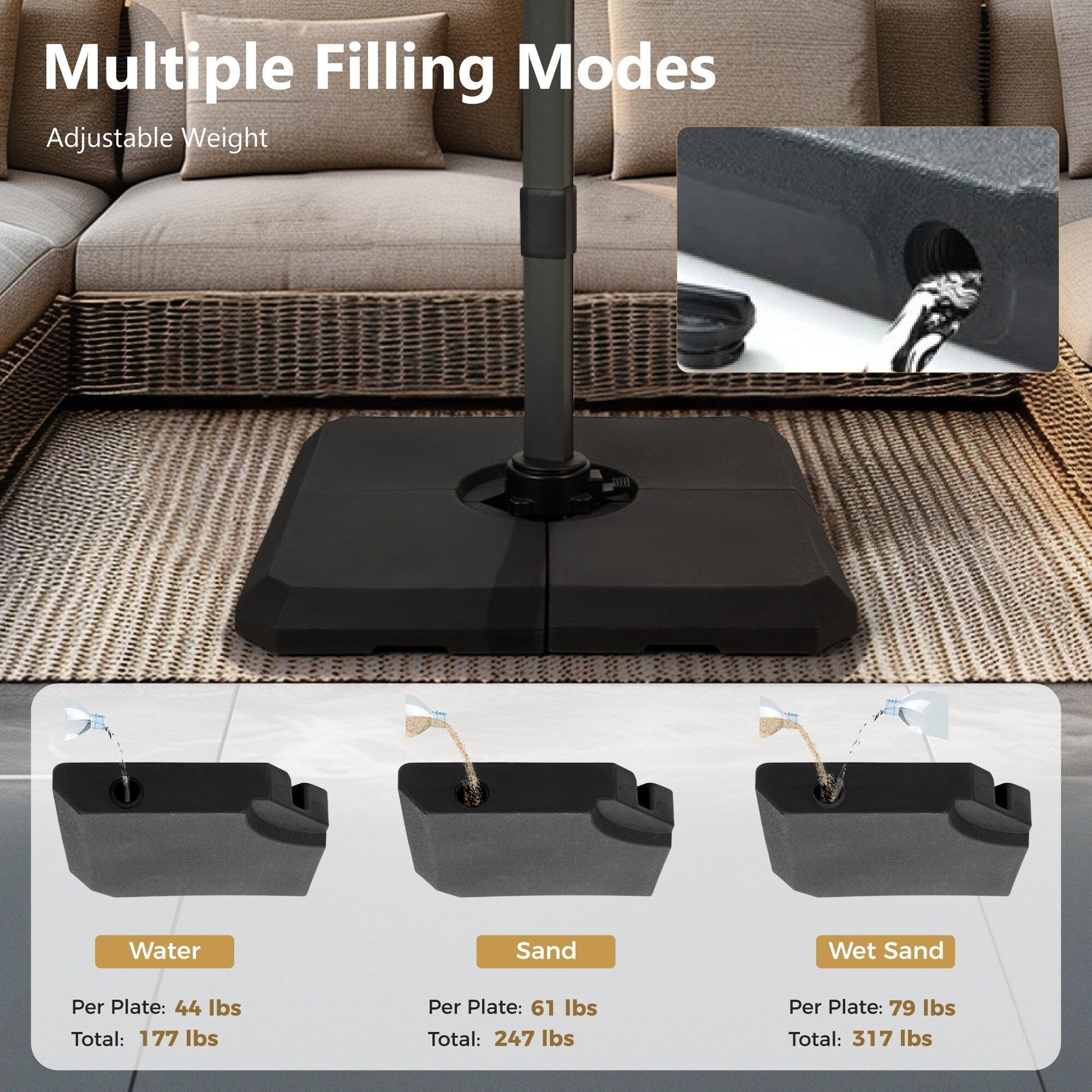 Remarque : Pour le poids, nous recommandons un socle en 4 parties d'au moins 30 kg chacune, pour un total de 120 kg. Pour votre sécurité et éviter tout dommage inutile, veuillez maintenir le parasol fermé et sécurisé lorsqu'il est exposé à un vent fort ou lorsqu'il n'est pas utilisé.