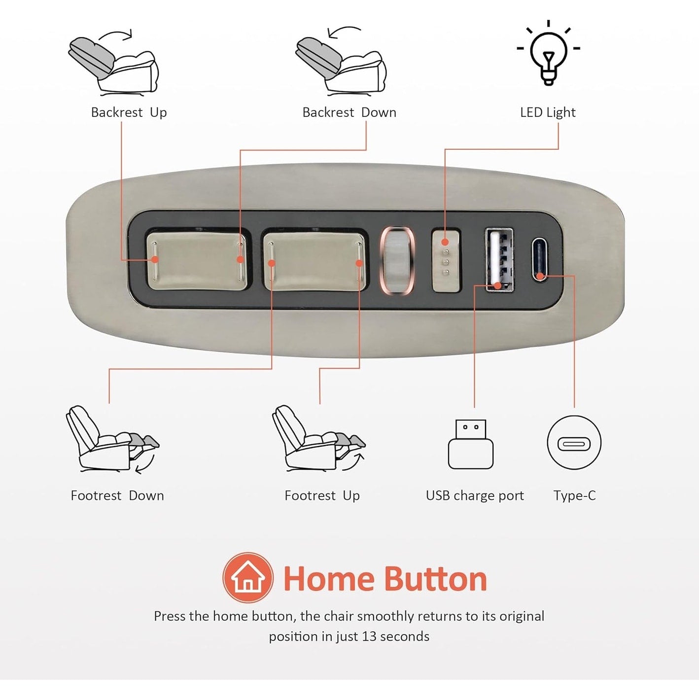 - RÉINITIALISATION PAR UNE SEULE TOUCHE ET ÉCLAIRAGE LED. Appuyez sur le bouton d'accueil et le fauteuil revient en douceur à sa position initiale en seulement 13 secondes. Les deux ports USB et Type-C de l'accoudoir prennent en charge tous les téléphones et tablettes, et l'éclairage LED assure une détente optimale.