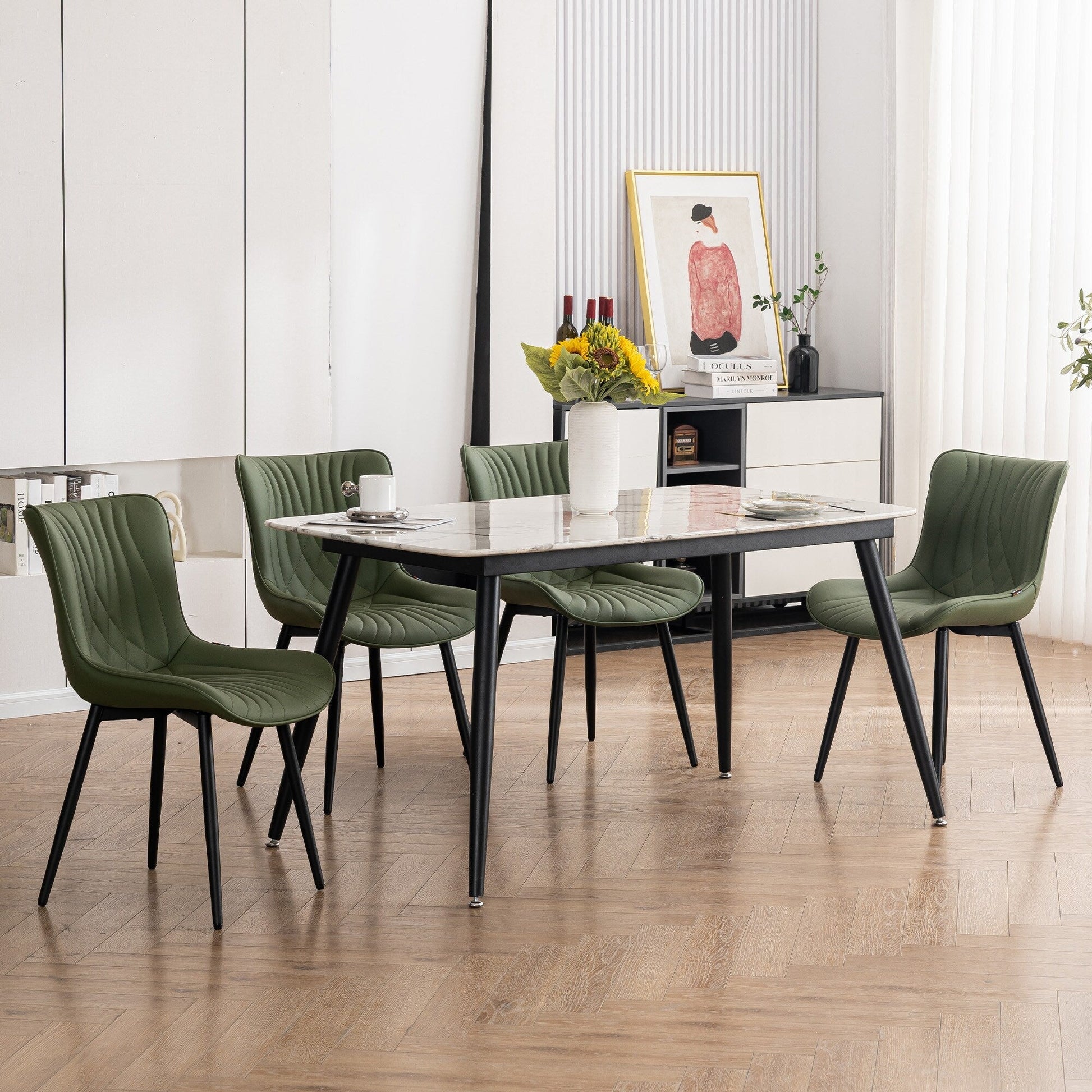 💞 Embellissez votre salle à manger avec un ensemble de chaises qui non seulement dynamisent votre décoration, mais épousent également les courbes de votre corps pour un confort accru. Avec leur jolie bande en queue de baleine, leurs assises en cuir et leur structure en métal robuste pour une durabilité accrue, ces chaises multi-matériaux accentuent leur style contemporain. Sans accoudoirs, nos chaises sophistiquées se glissent facilement dans les espaces vides de la table pour un gain de place optimal et offrent un équilibre parfait entre style élégant et fonctionnalité. Polyvalentes, ces chaises de cuisine et de salle à manger conviennent à une grande variété d'environnements : salles à manger, cuisines, salons, chambres d'amis, salles d'attente et même maisons de vacances. Elles peuvent servir de fauteuils de lecture confortables, de coussins d'angle confortables, de fauteuils de maquillage, de fauteuils de salon, etc.
