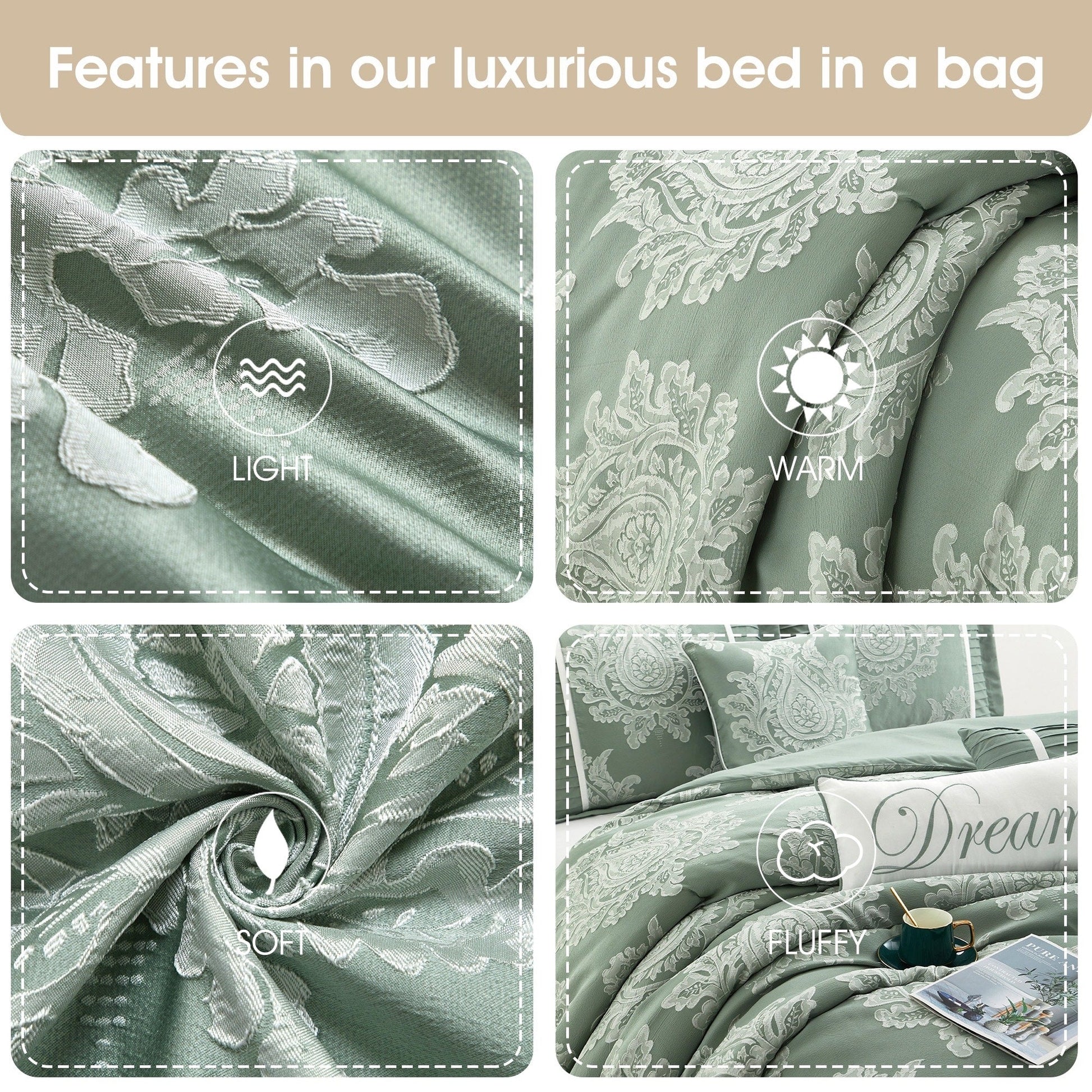 Insufflez une touche d'élégance intemporelle à votre chambre avec notre luxueux ensemble de couettes 7 pièces. La couette et les taies d'oreiller raffinées arborent fièrement un superbe motif médaillon jacquard avec une bordure plissée, créant un effet visuel saisissant et dimensionnel. Confectionné en tissu jacquard texturé, cet ensemble apporte une touche de sophistication et de charme à tous les styles de décoration. Léger et idéal en toutes saisons, il sublime l'ambiance de votre espace grâce à ses détails raffinés et son design classique.